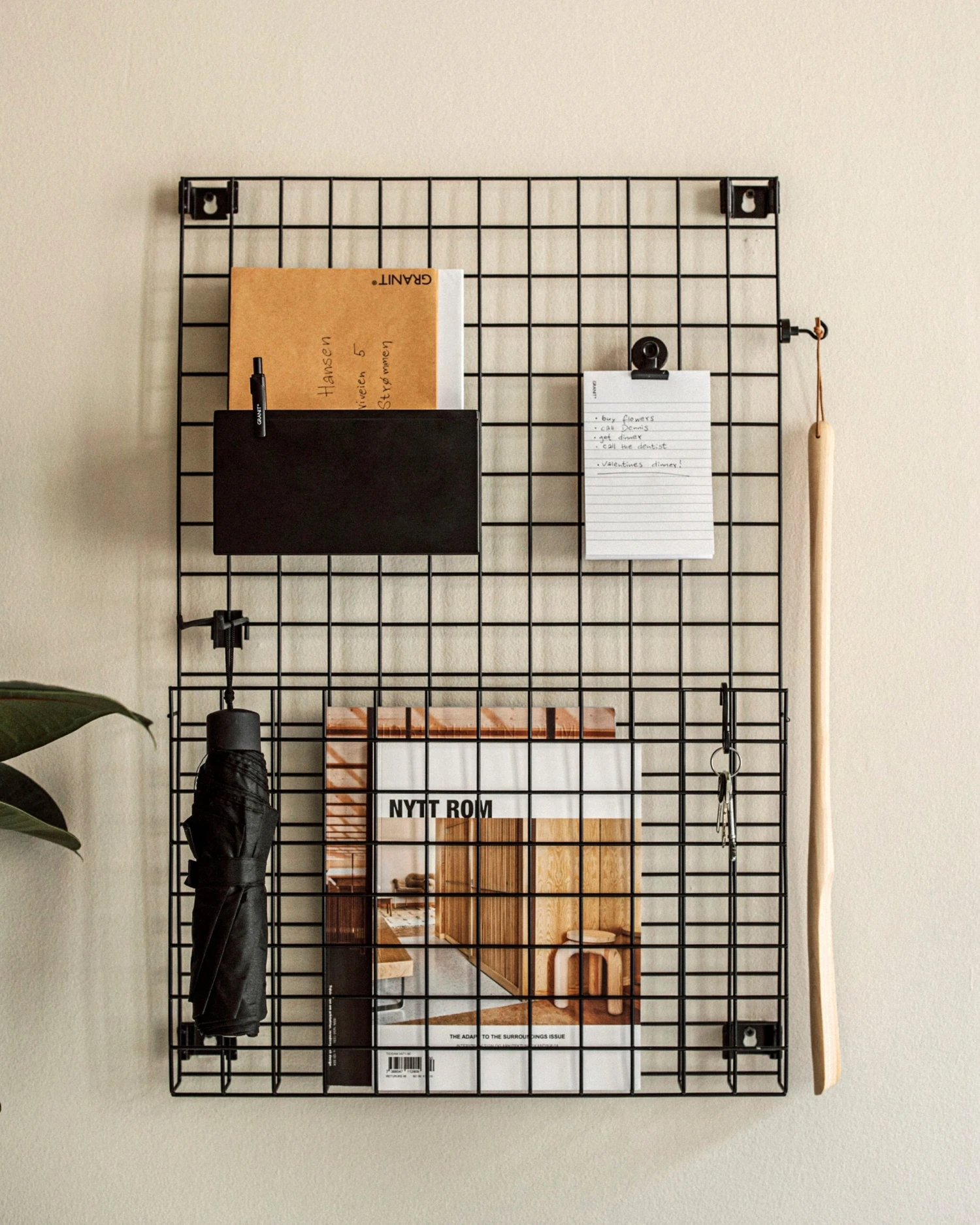 Cleveres und schönes Aufbewahrungsgitter für die Wand. Das schwarze Metallgitter eignet sich perfekt, um Zeitschriften oder Post schön und griffbereit aufzubewahren. In Kombination mit unseren anhängbaren Körben, Klammern und S-Haken verwandelst du das Gitter zu einem kompletten Aufbewahrungssystem. Schrauben sind nicht im Lieferumfang enthalten.