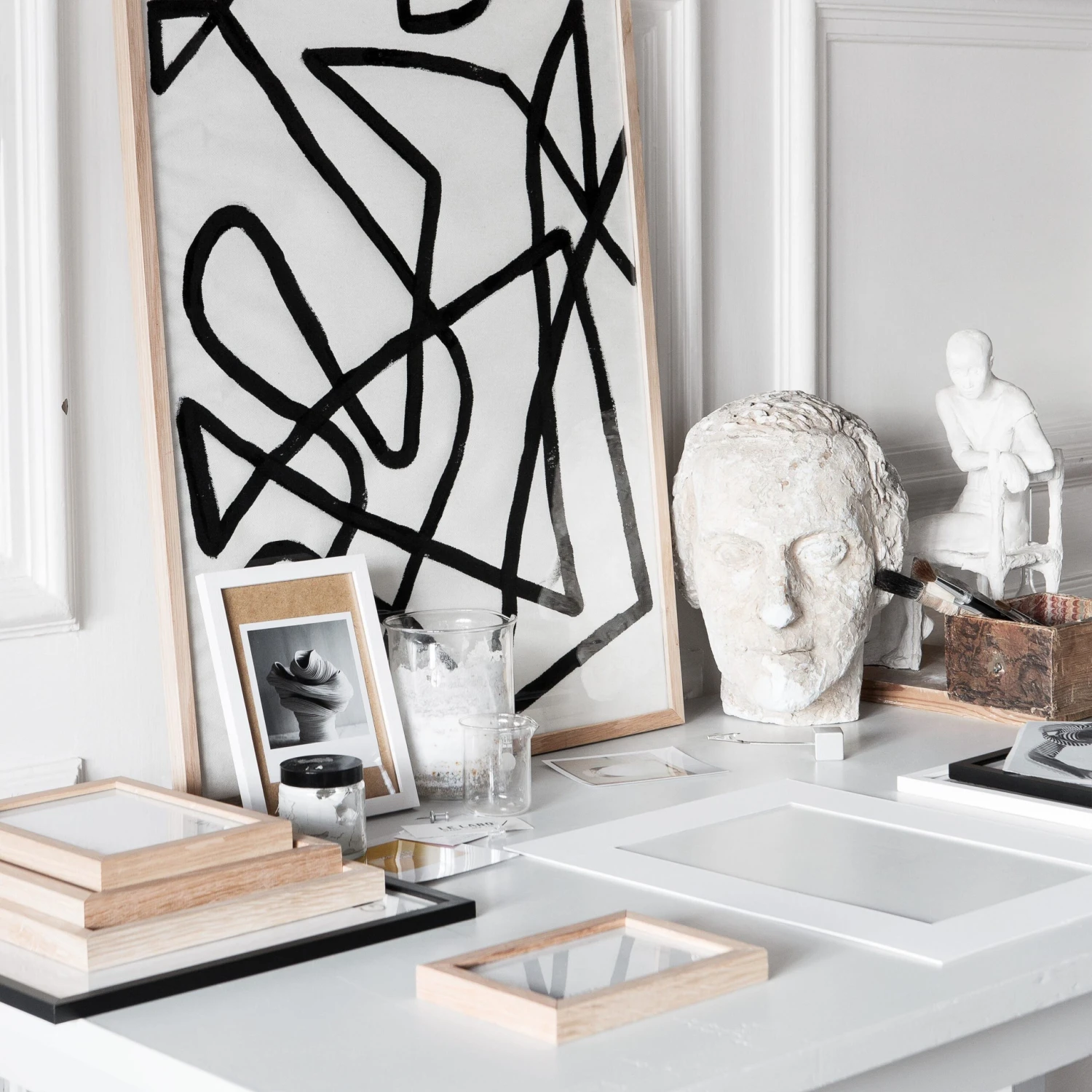 Bilderrahmen aus unbehandeltem Eichenholz mit Rückseite aus MDF und einer Glasscheibe.