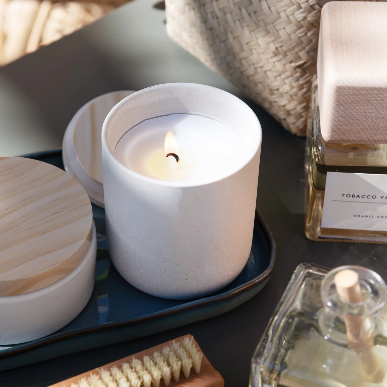 Eine Duftkerze auf Sojawachsbasis mit dem herrlich frischen Duft Pink Grapefruit. Der Diffusor ist ein Keramikbehälter mit einem Holzdeckel aus FSC-zertifiziertem Holz.
