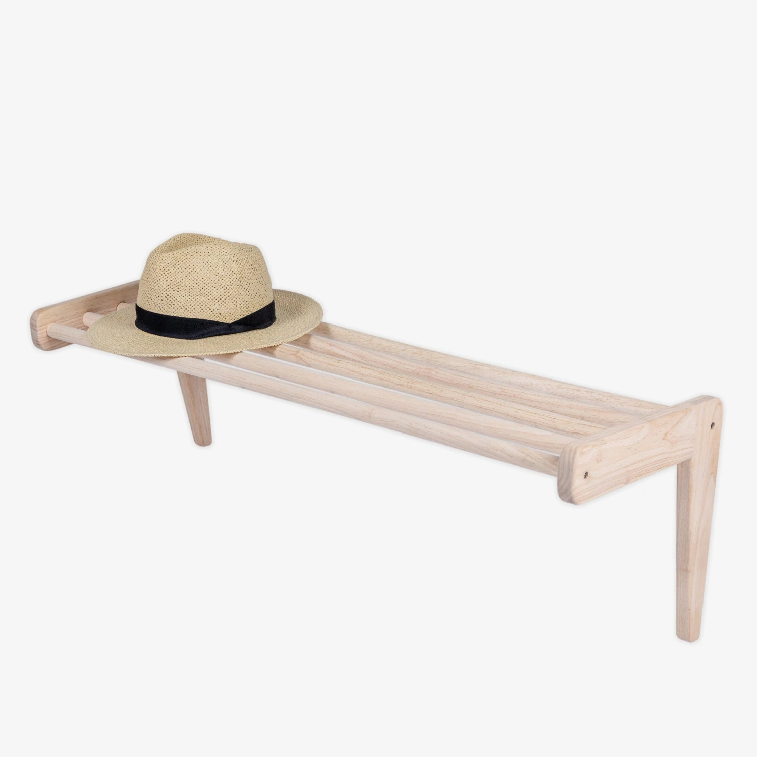 Bringe Ordnung in den Flur mit einer klassischen Hutablage aus Holz. Das Regal ist aus unbehandeltem, zertifiziertem Kautschukholz gefertigt und kann auch zum Abstellen kleinerer Körbe oder Kisten verwendet werden. Achte nur darauf, dass du es richtig festschraubst und nicht zu viel Gewicht darauf ablegst.Maße: L: 94,4 cm B: 30,4 cm H: 30,4 cm.