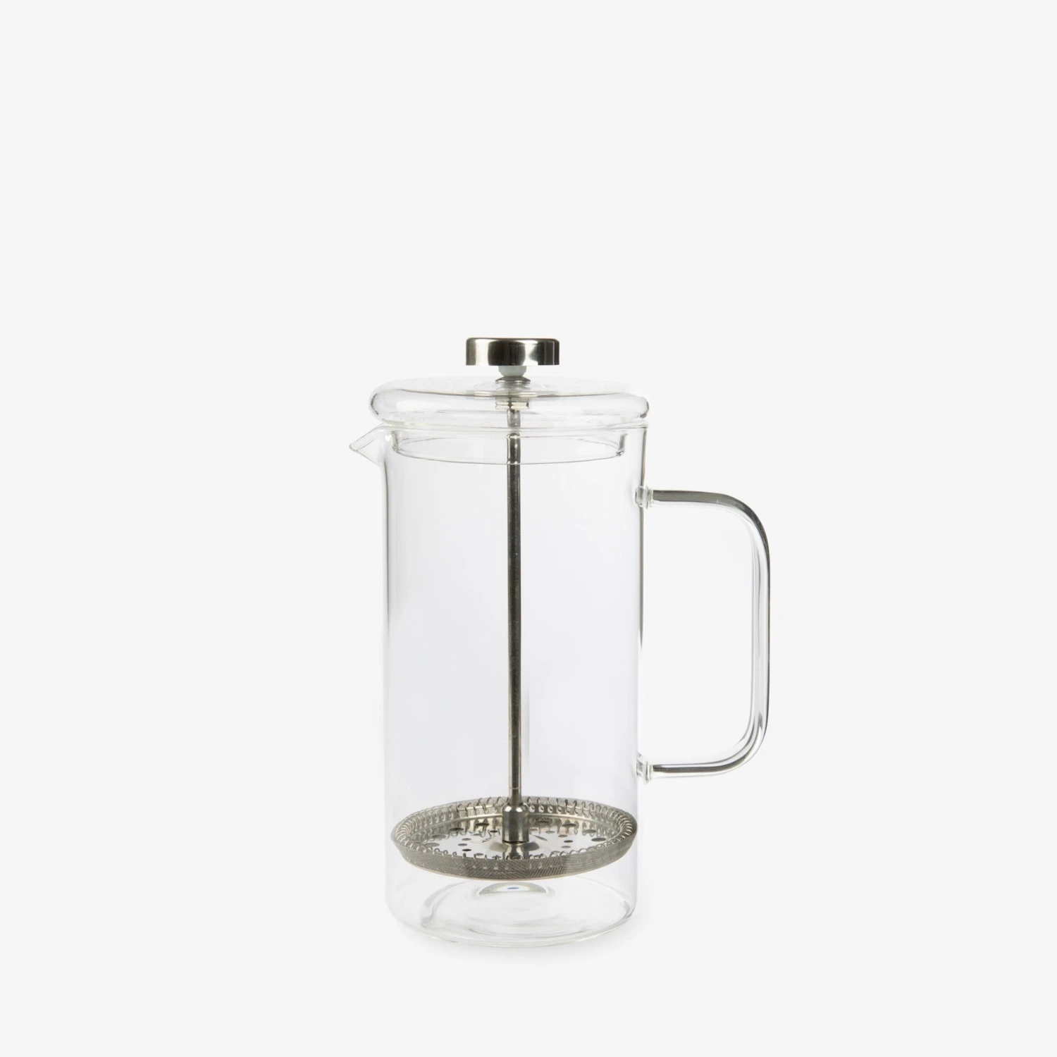 Kaffeepresse aus Glas und rostfreiem Stahl. In einer Kaffeepresse wird der Kaffee vollständig im Wasser gebrüht und dann durch einen Metallfilter gefiltert. Es entstehen mehr Kaffeeöle und andere Aromastoffe im Kaffee als bei der Zubereitung mit einer normalen Kaffeemaschine mit Papierfilter.