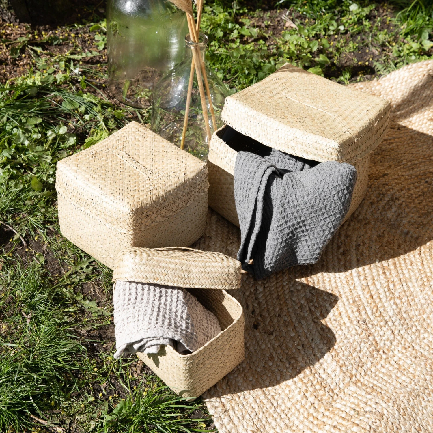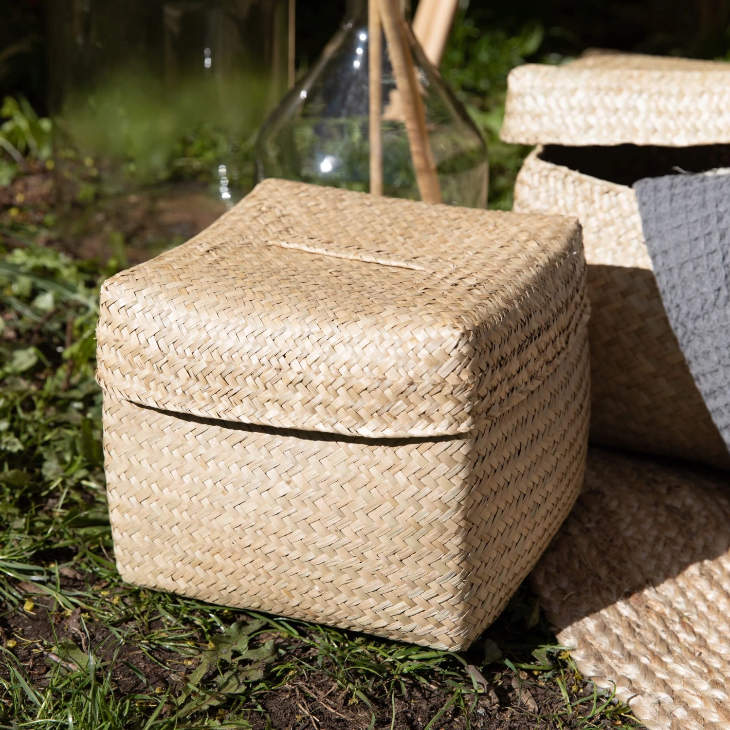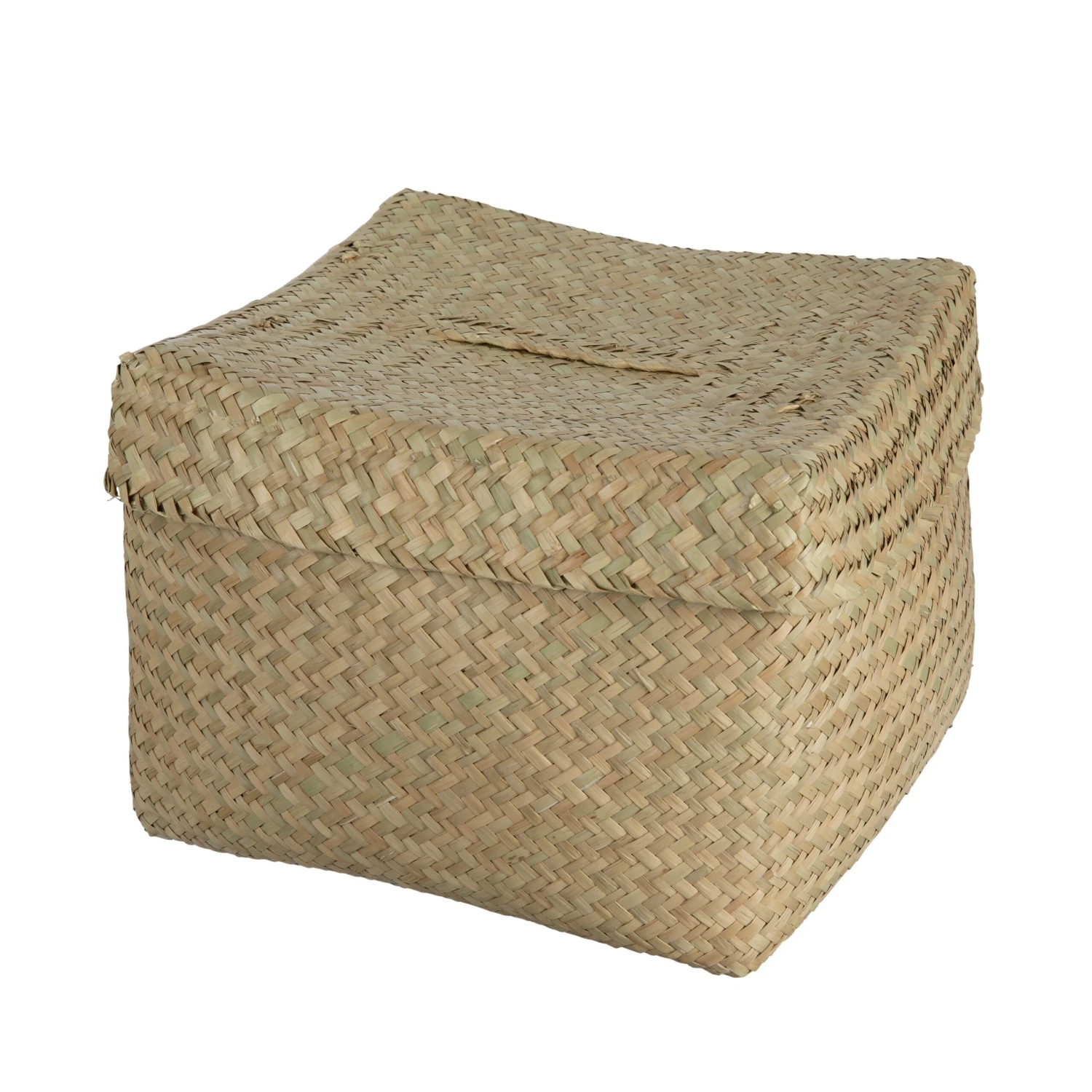 Rechteckiger Korb aus Seegras mit passendem Deckel. Der Deckel hat einen Griff an der Oberseite. Auch in zwei kleineren Größen erhältlich!