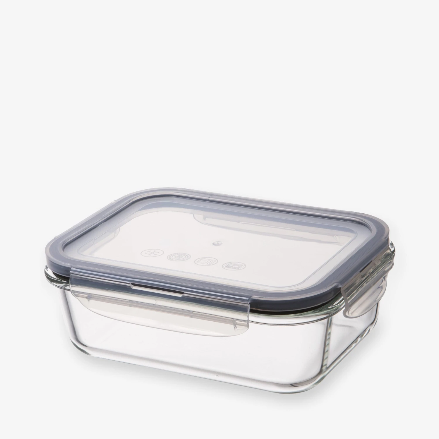 Rechteckige Lebensmittelbox aus Borosilikatglas mit Deckel aus PP-Kunststoff und mit Silikonstreifen. Volumen: 1,04 Liter.