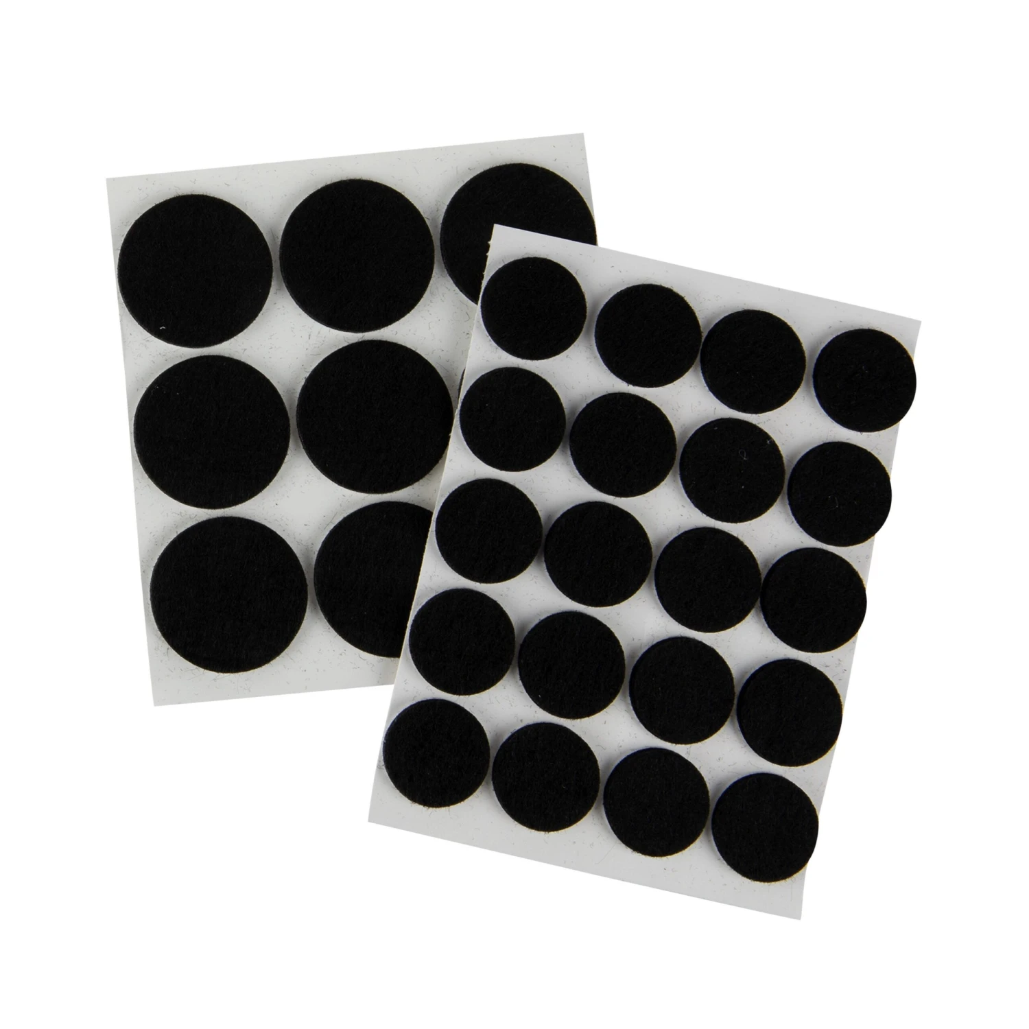 Schwarze Möbelfilze in 2 verschiedenen Größen, insgesamt 29 Stück. 9 Stück sind 3 cm und 20 Stück sind 2 cm groß.