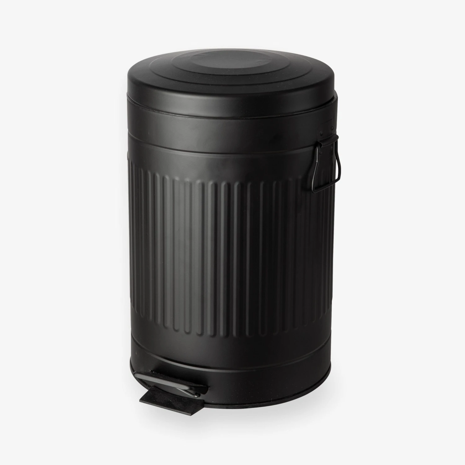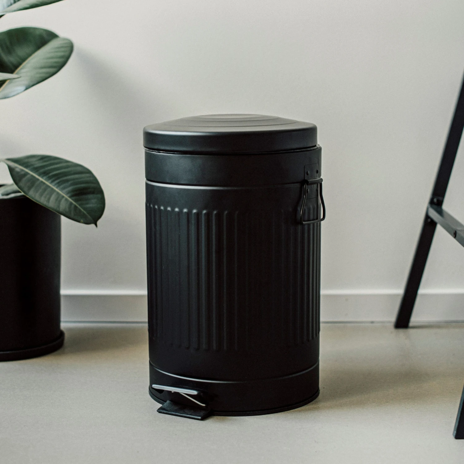 Schwarzer Pedal-Eimer aus Metall mit herausnehmbarem Kunststoffeimer, der 12 Liter fasst. Auch in einer kleineren und einer größeren Größe erhältlich.
