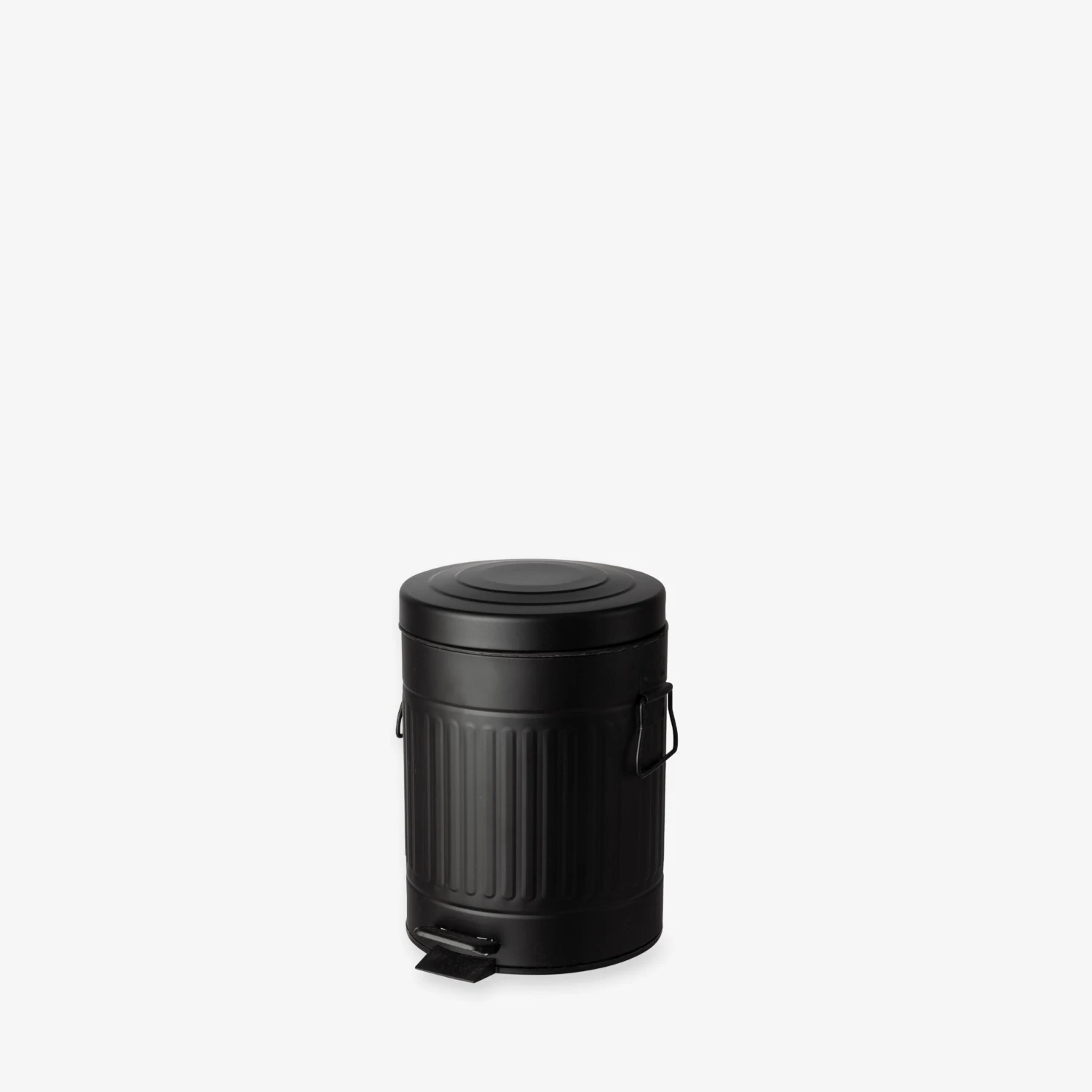 Schwarzer Pedal-Eimer aus Metall mit herausnehmbarem Kunststoffeimer, der 5 Liter fasst. Auch in zwei größeren Größen erhältlich.