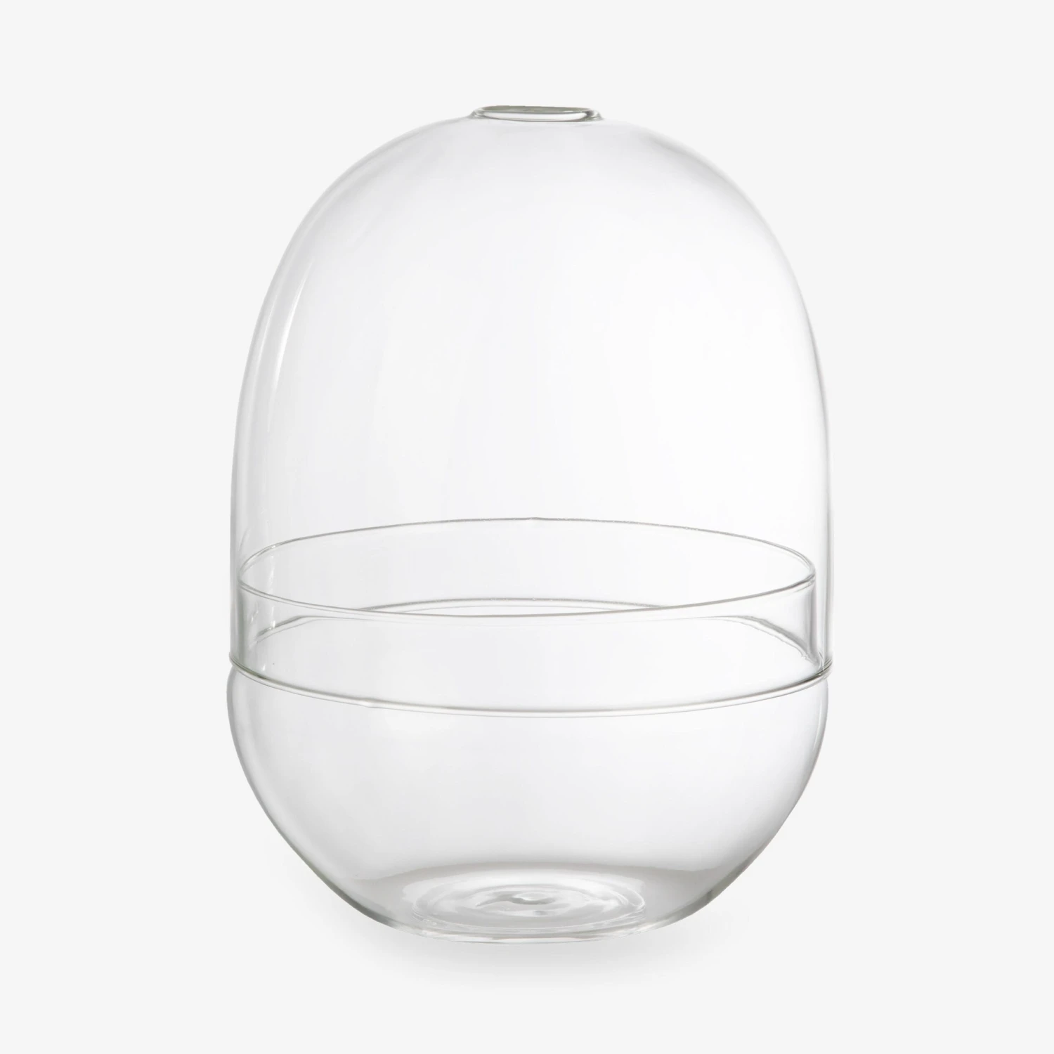 Pflanzengehäuse mit einer dazugehörigen Glaskuppel. Die Glaskuppel hat oben ein Loch, durch das der Sauerstoff eindringen kann. In einen Topf mit einer Pflanze stellen oder direkt in der Kuppel züchten.Auch in einer kleineren Größe erhältlich.