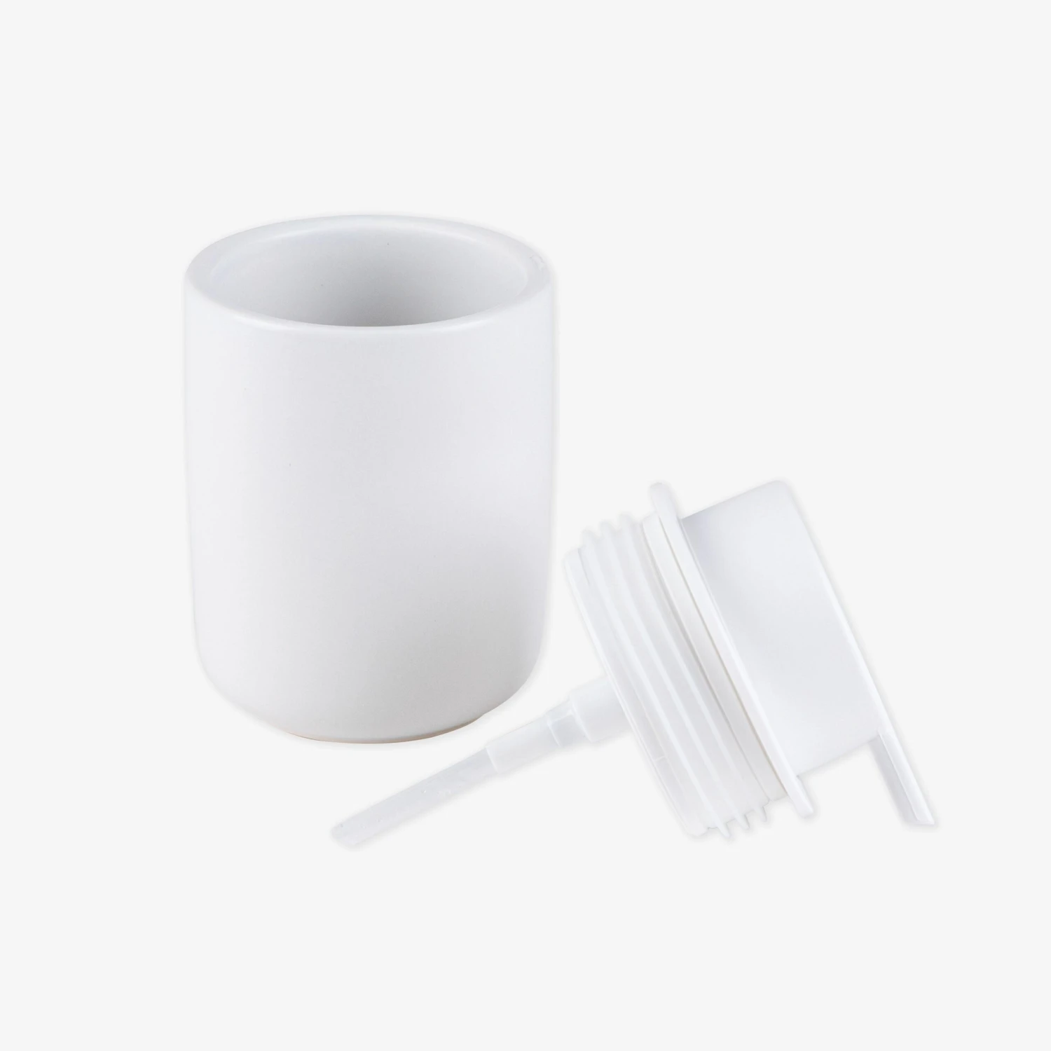 Stilvoller Seifenspender aus mattweißem Dolomitstein mit praktischer Kunststoffpumpe. Die Seifenpumpe kann mit einer Toilettenbürste und einem Zahnputzbecher aus demselben Material kombiniert werden. Auch in schwarz erhältlich.