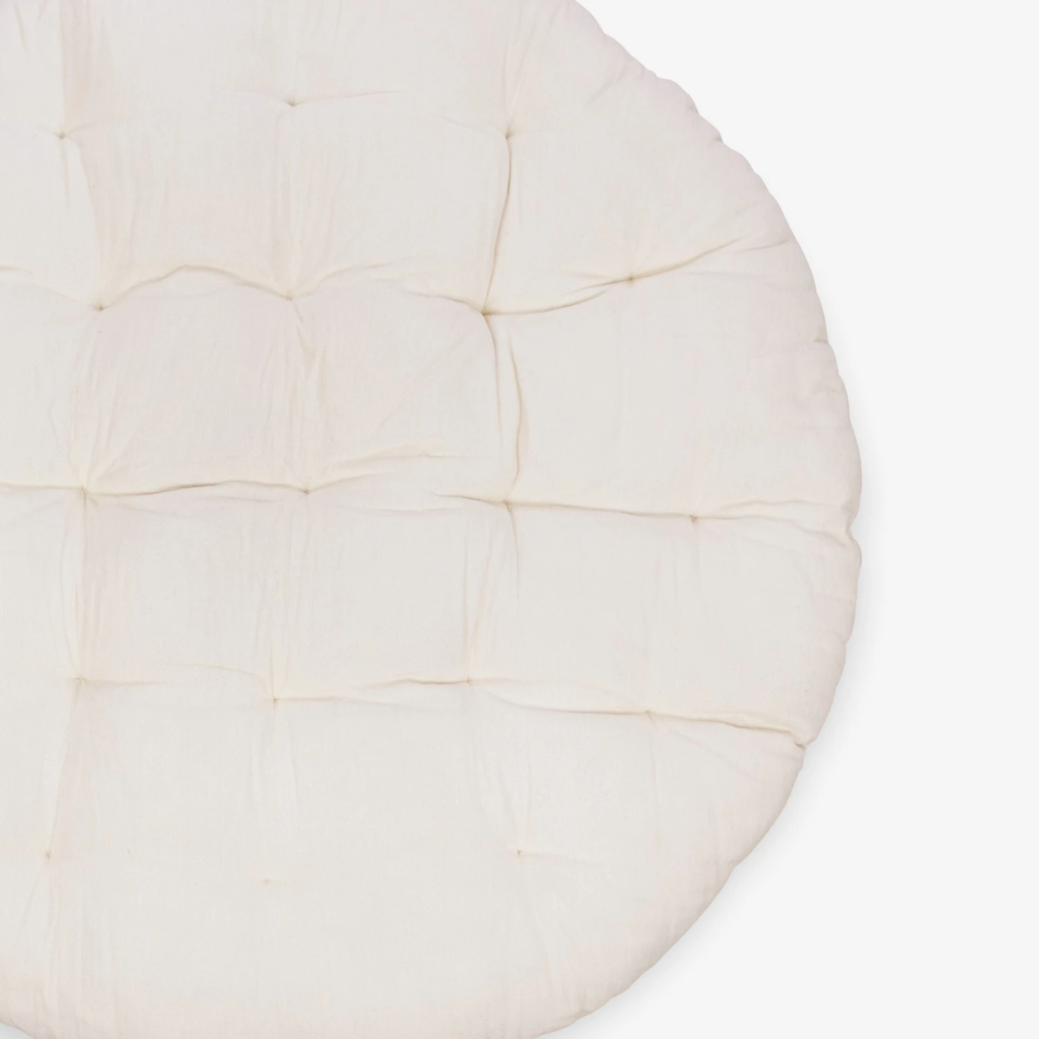 Ein großes, rundes, dickes Kissen in cremefarbener Farbe aus 100 % Baumwolle. Passt in unseren großen runden Rattansessel und eignet sich auch, um direkt auf dem Boden gemütlich zu sitzen. Das Kissen ist an einer Seite mit Bändern versehen, mit denen es am runden Rahmen des Sessels befestigt wird. Füllung aus recycelter Baumwolle.