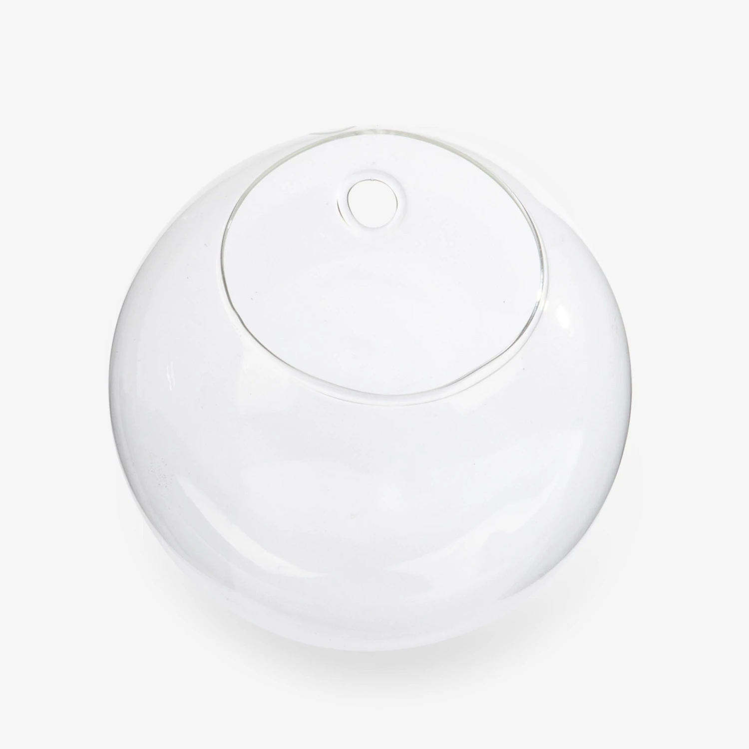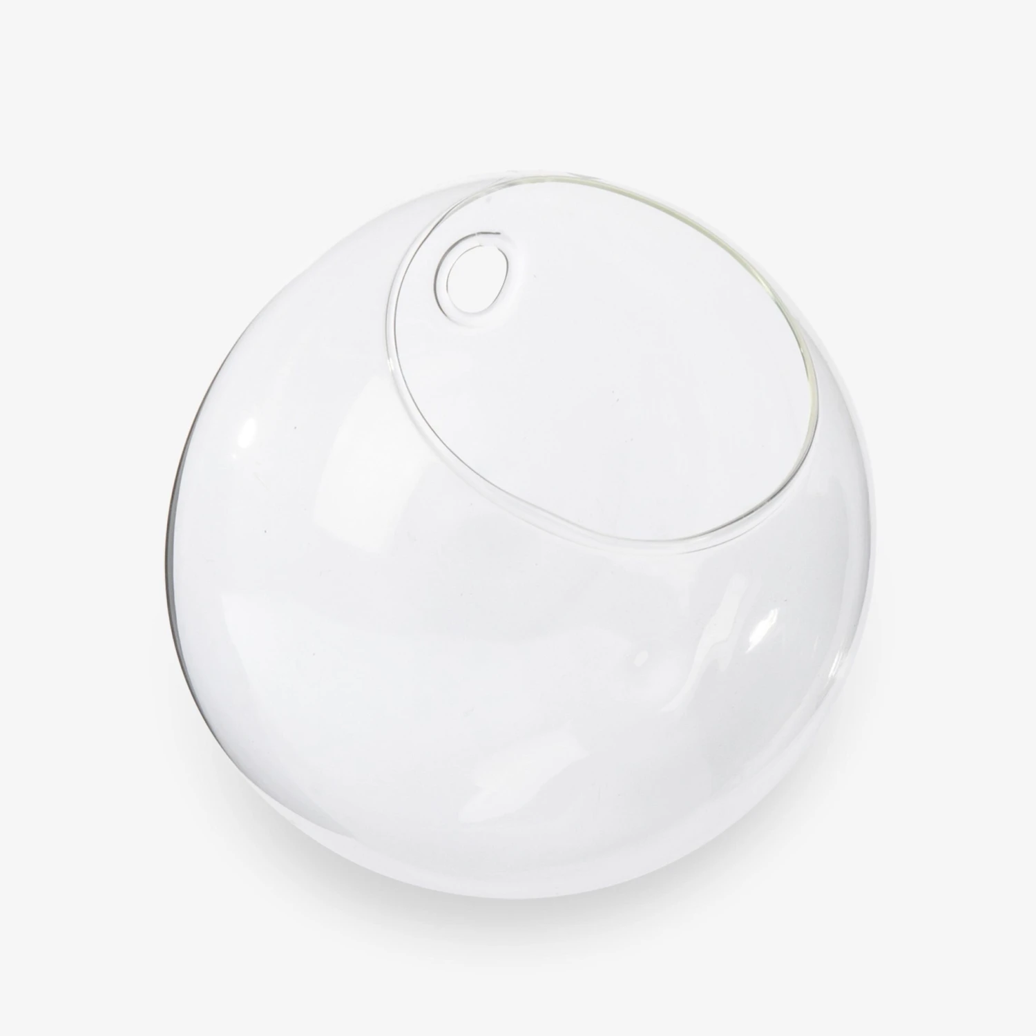 An der Wand befestigte Vase oder kleiner Glasblumentopf. Die Vase hat ein Loch, mit dem sie an die Wand gehängt werden kann.