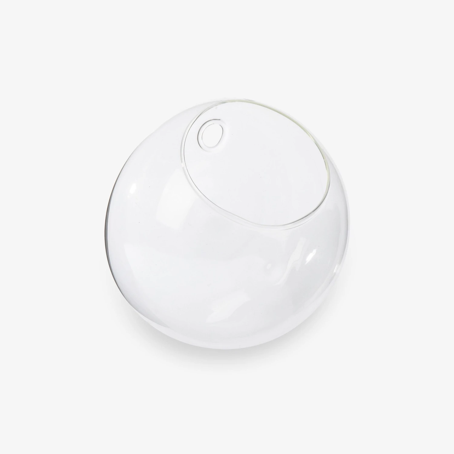 An der Wand befestigte Vase oder kleiner Glasblumentopf. Die Vase hat ein Loch, mit dem sie an die Wand gehängt werden kann.